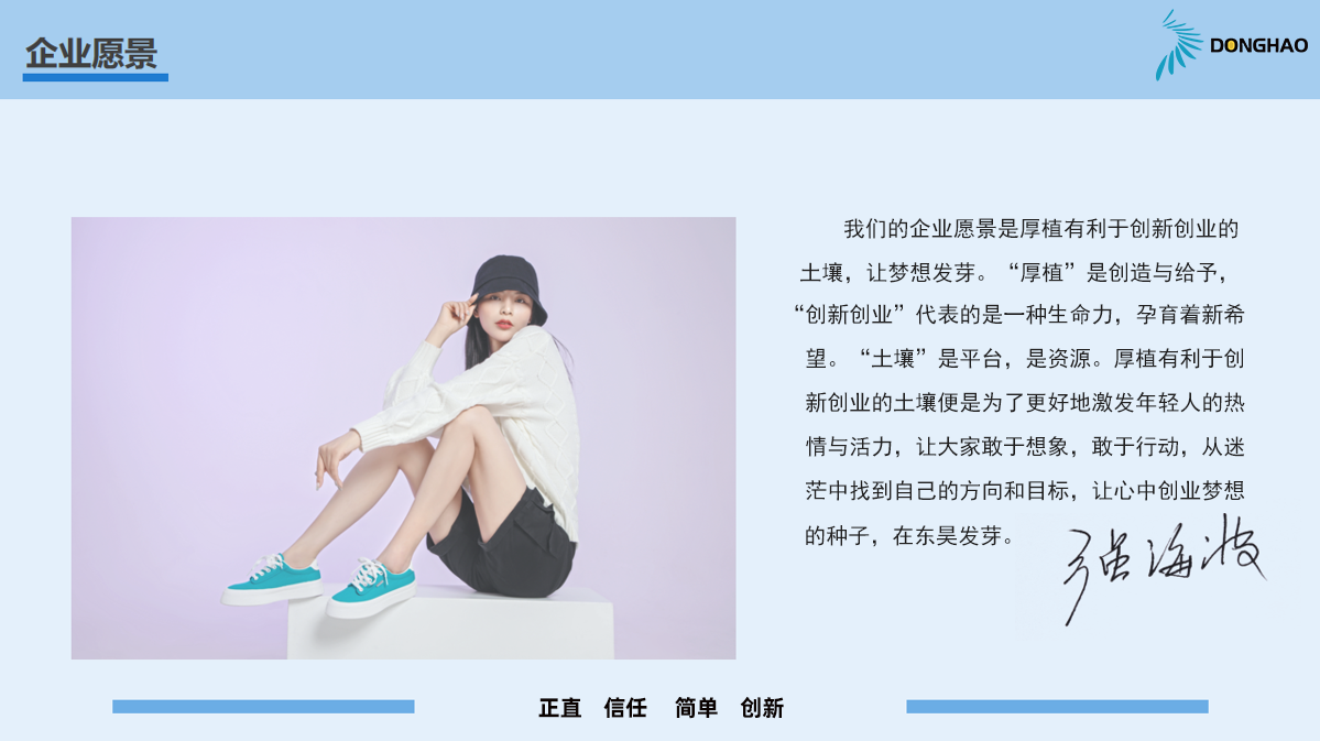 我們的企業愿景是厚植有利于創新創業的土壤,讓夢想發芽。創者,始造也。“厚植”是創造與給予,“創新創業”代表的是一種生命力,孕育著新希望。“土壤”是平臺,是資源。