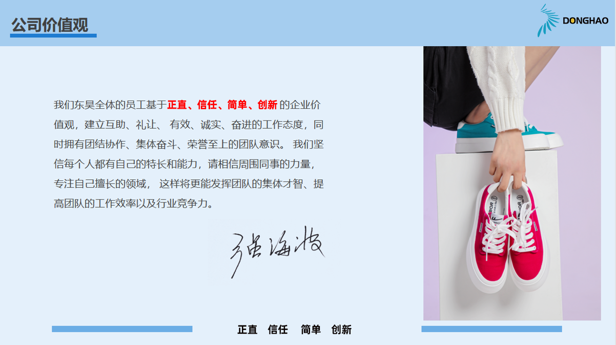 我們東昊全體的員工基于正直、信任、簡單、創新的企業價值觀,建立互助、禮讓、有效、誠實、奮進的工作態度,同時擁有團結協作、集體奮斗、榮譽至上的團隊意識。我們堅信每個人都有自己的特長和能力,請相信周圍同事的力量專注自己擅長的領域,這樣將更能發揮團隊的集體才智、提高團隊的工作效率以及行業競爭力。 --東昊總經理 強海波